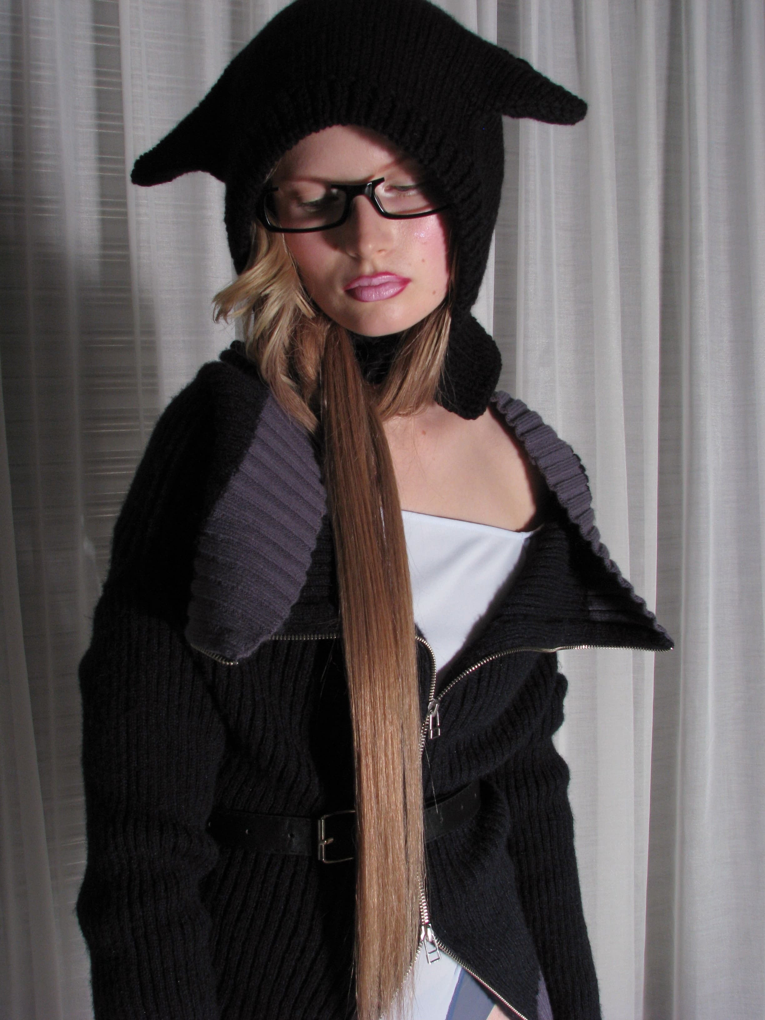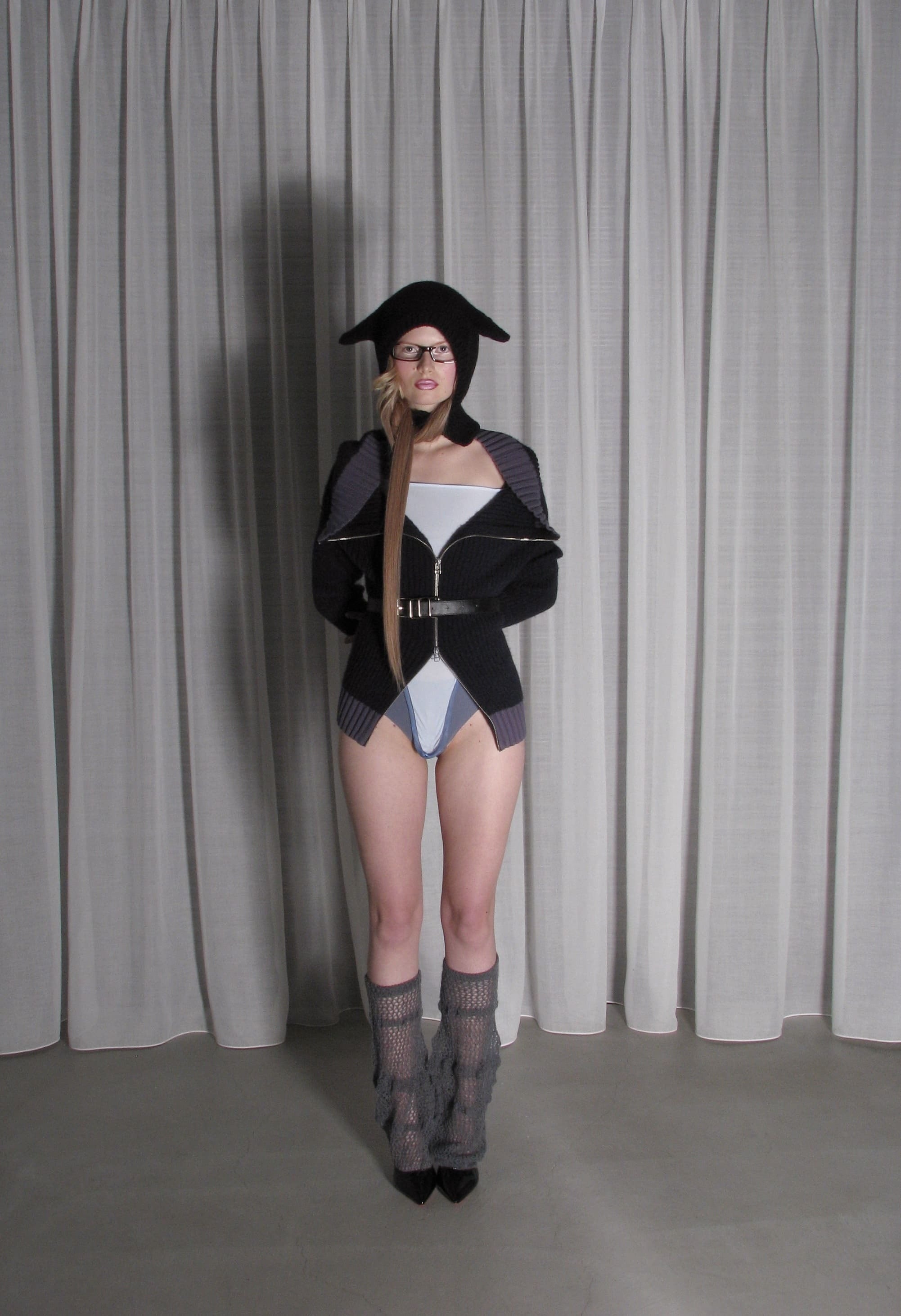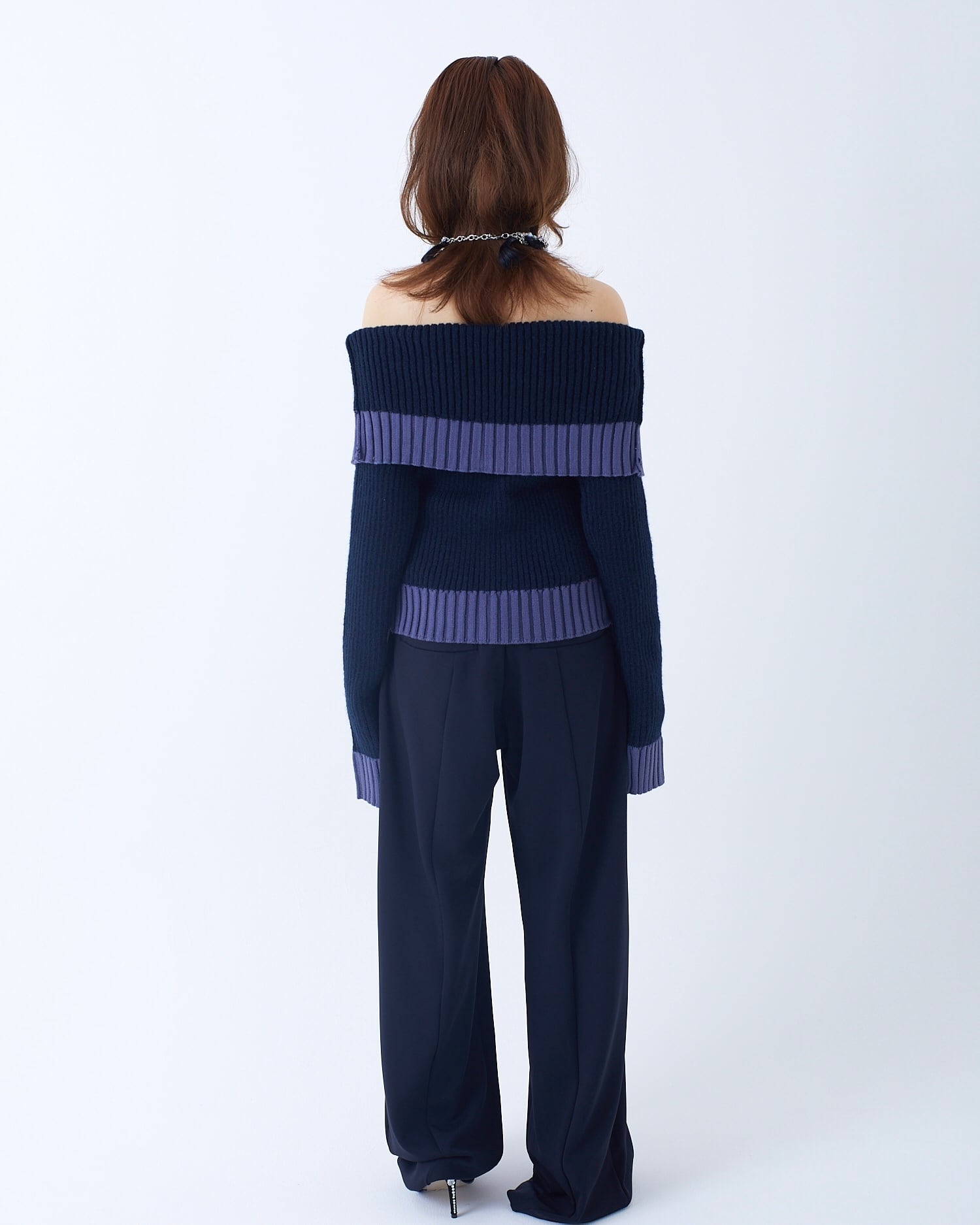 筒状の形に袖を付けたリブニットは、着る人の発想で何通りものスタイリングが楽しめる一着