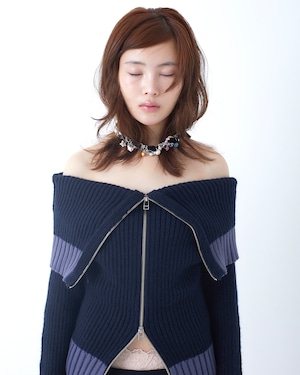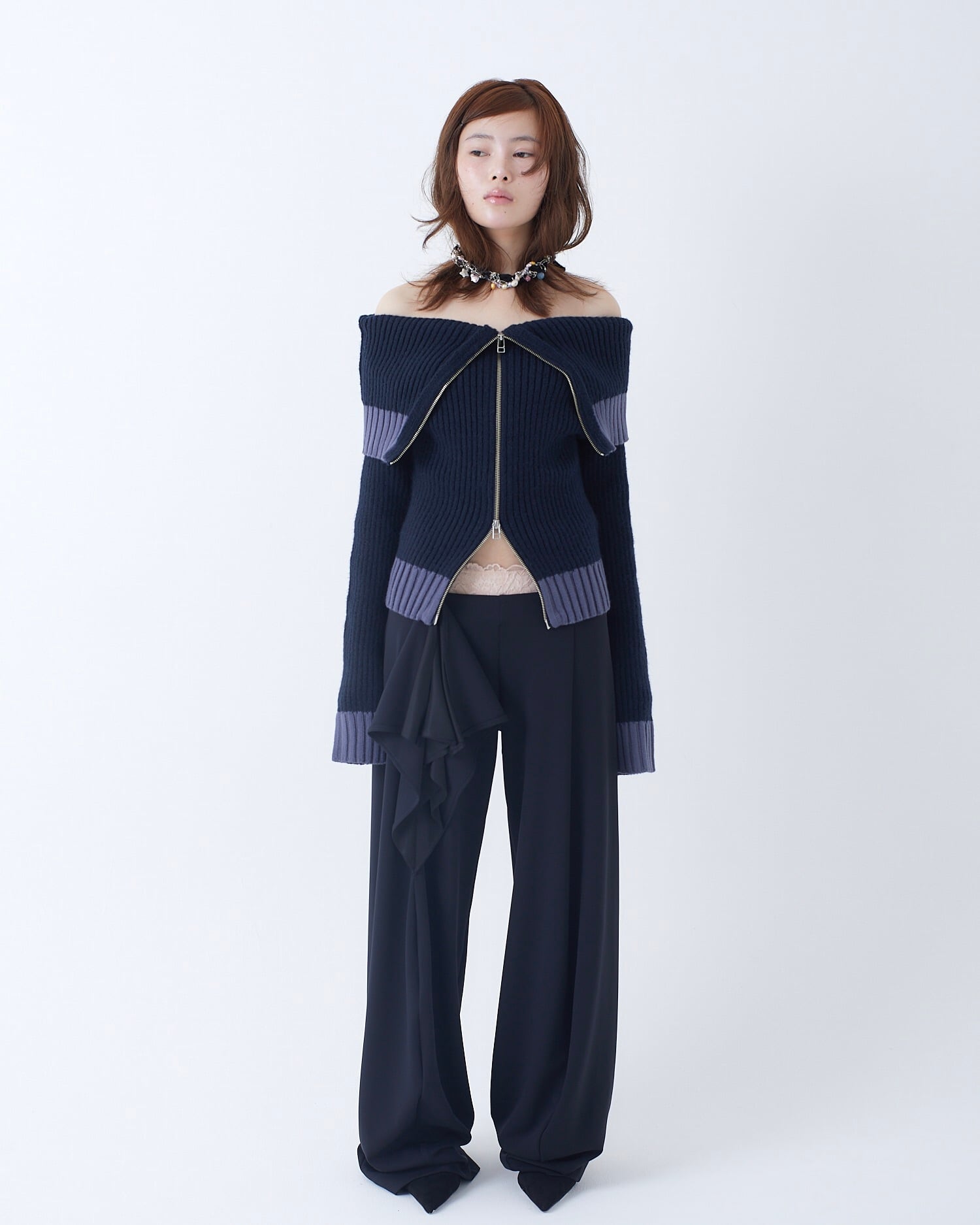 タイトなスカートとして、ニットカーディガンとして、フロントのジップは逆開式のため開き方でもさまざまな表情を見せることができます