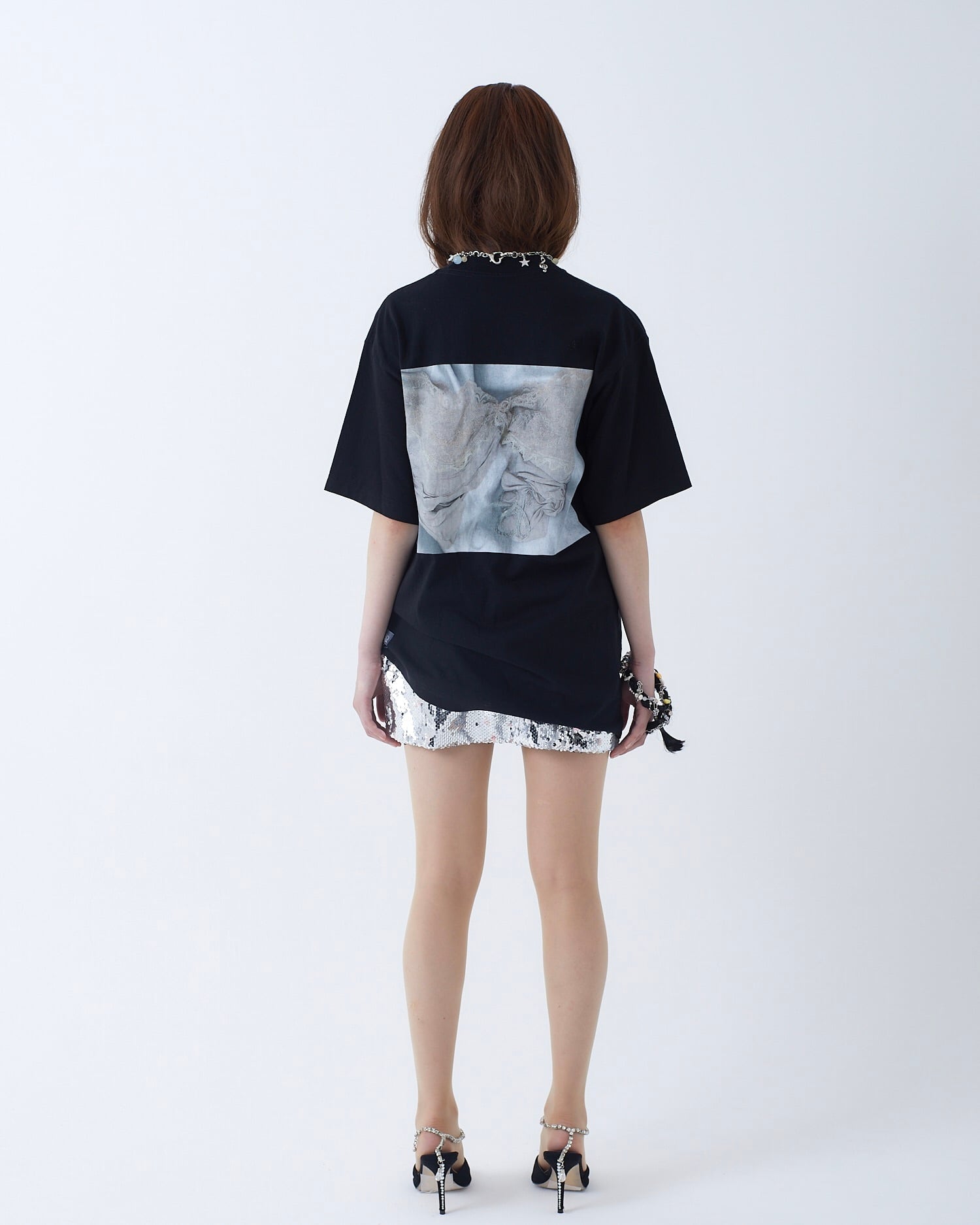 リボンをプリンター上で歪ませた写真がバックに大きく刷られたインパクトのある一着