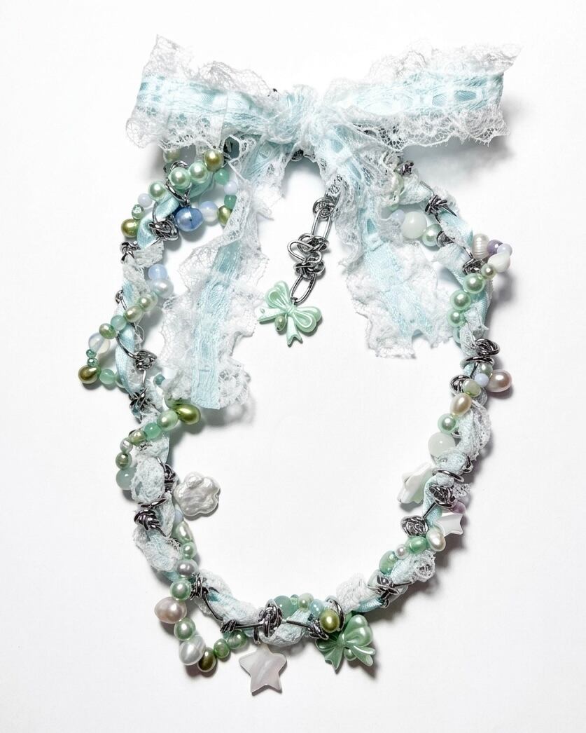 レースのついたボリューミーなミントカラーのリボンがキュートなネックレスです